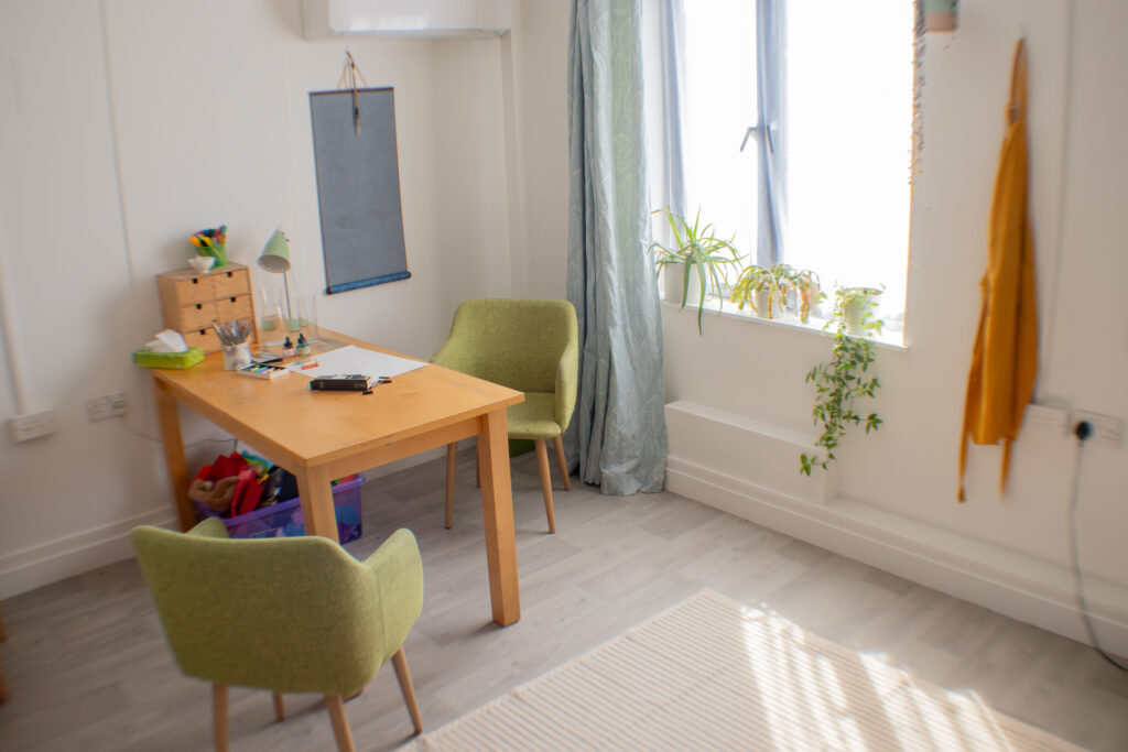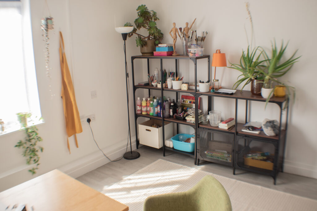 The art therapy room can be accessed by stairs or lift and is located on the second floor of a building on Mare Street in Hackney, near the southern end of London Fields. The building is used by various kinds of therapists.